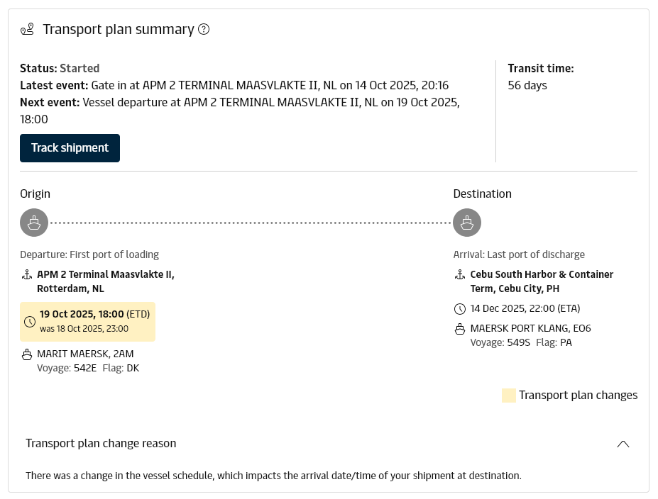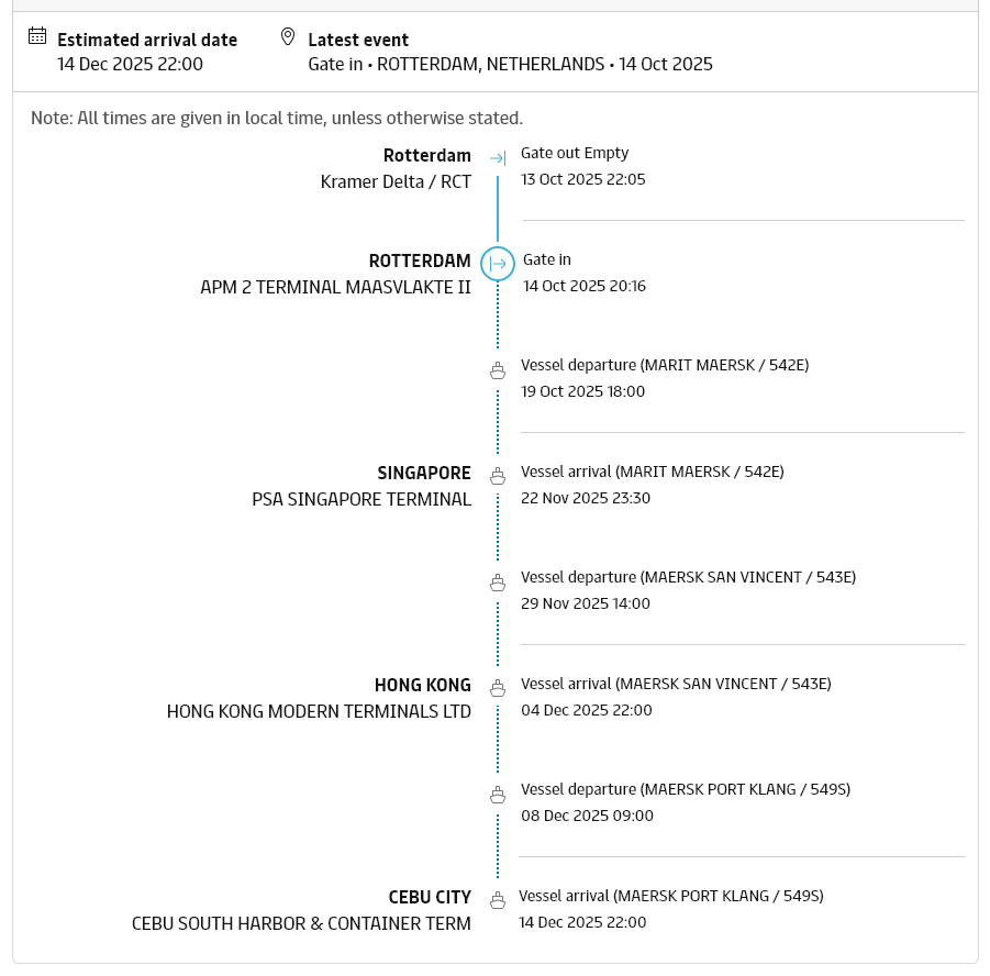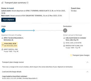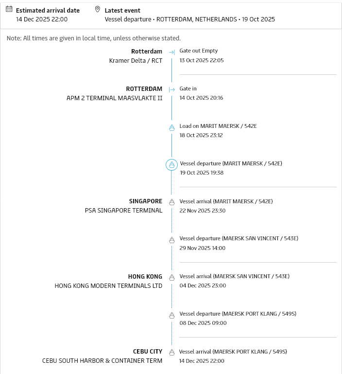 Here you can follow the boat from Rotterdam port to Cebu port.