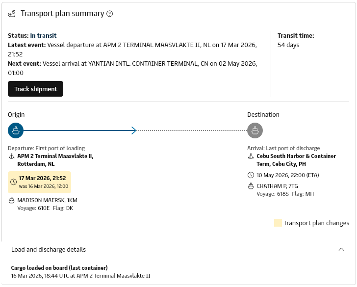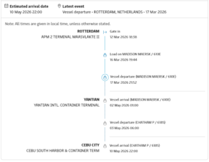 Here you can follow the boat from Rotterdam port to Cebu port.